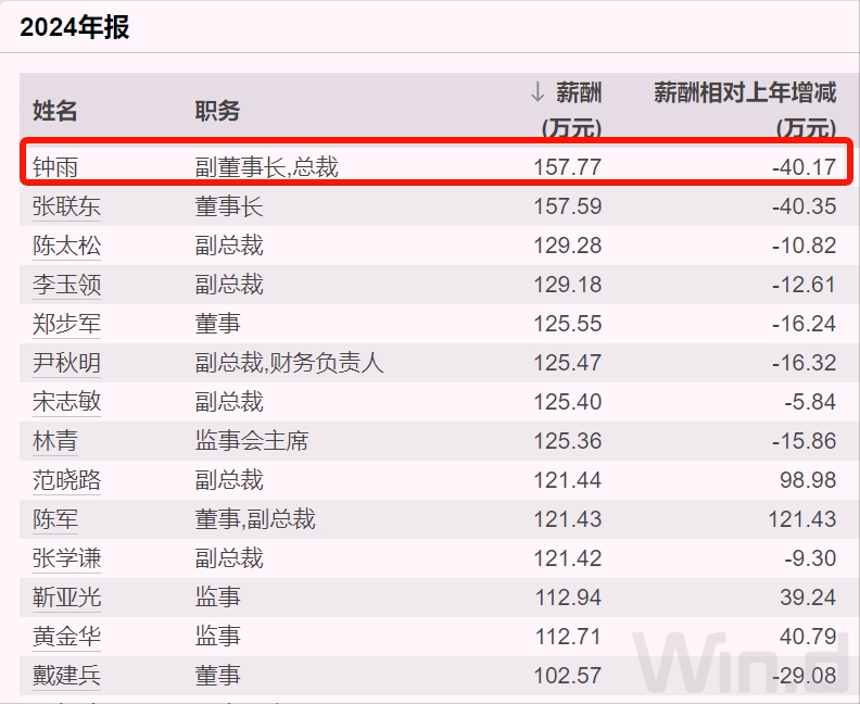 根据年报,2024年钟雨的薪酬为157.8万元,比2023年减少40万元,略超过原董事长张联东。