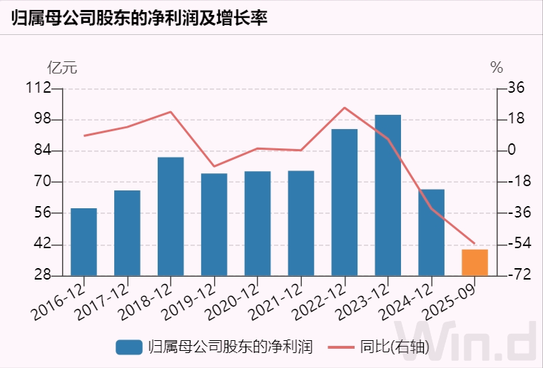 在钟雨出任总裁10年间,洋河股份净利润曾在2023年达到100亿元新高,但2024年公司业绩“双降”,收入下滑12.8%,净利润下降33.4%,还剩下66.7亿元。