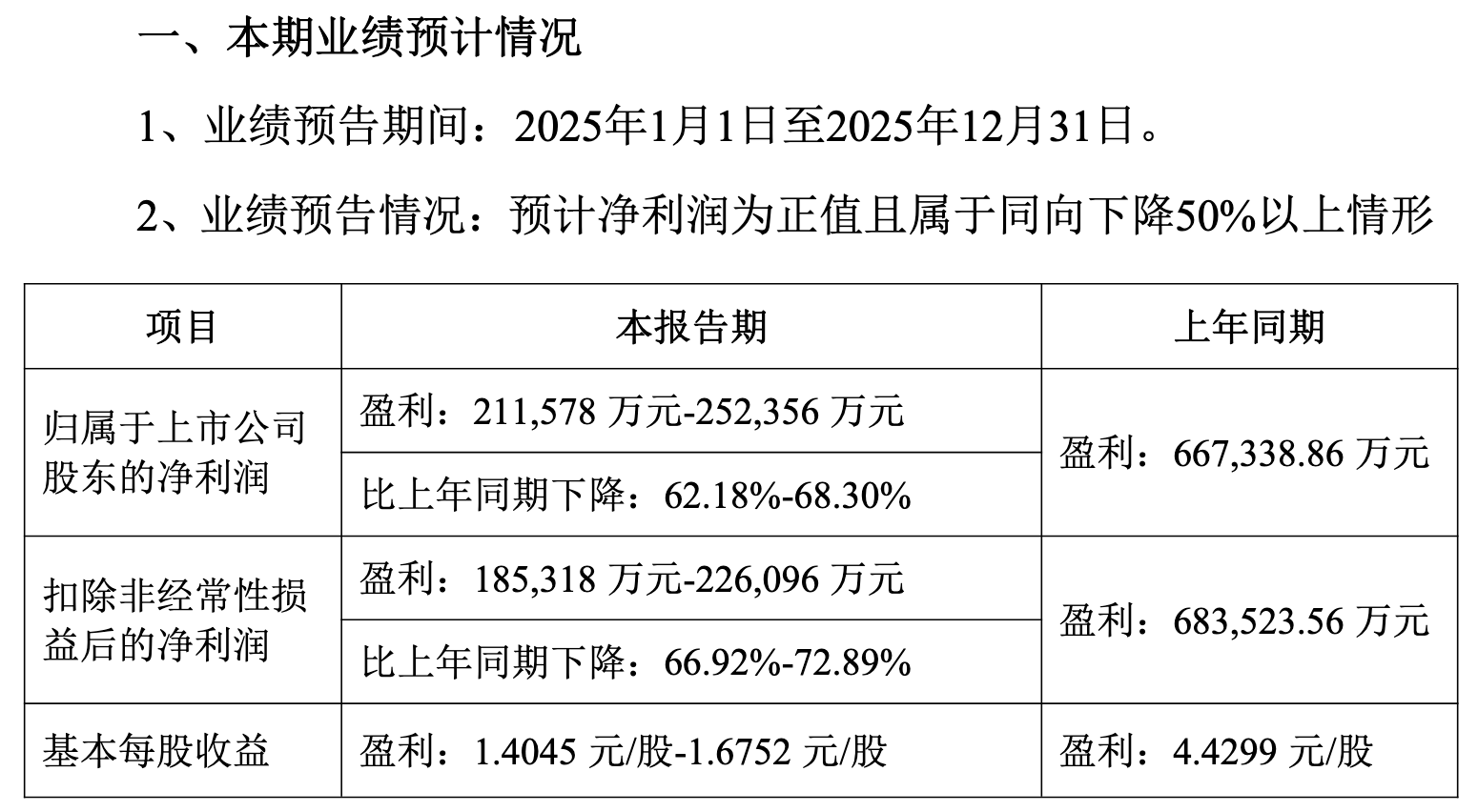 1月23日晚间,洋河股份发布业绩预告,公司预计2025年度归属于上市公司股东的净利润为21.16亿元-25.24亿元,同比下降62.18%-68.3%;预计扣除非经常性损益后的净利润为18.53亿元-22.61亿元,同比下降66.92%-72.89%。