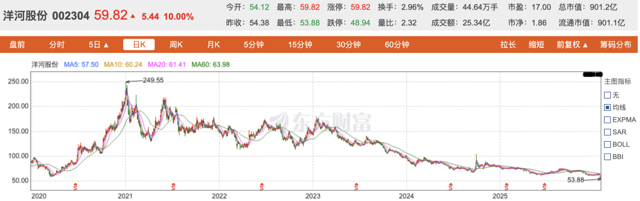 数据显示,1月26日,洋河股份接近跌停,最终跌幅9.85%,收盘价56.39元/股;27日,洋河股份再跌3.62%;28日,勉强止住下跌趋势,股价微涨0.06%;29日早盘,更是创下最近几年的股票最低价53.88元/股,下午或受整体白酒板块的涨停潮影响,在接近收盘时终于涨停,报收于59.82元/股。