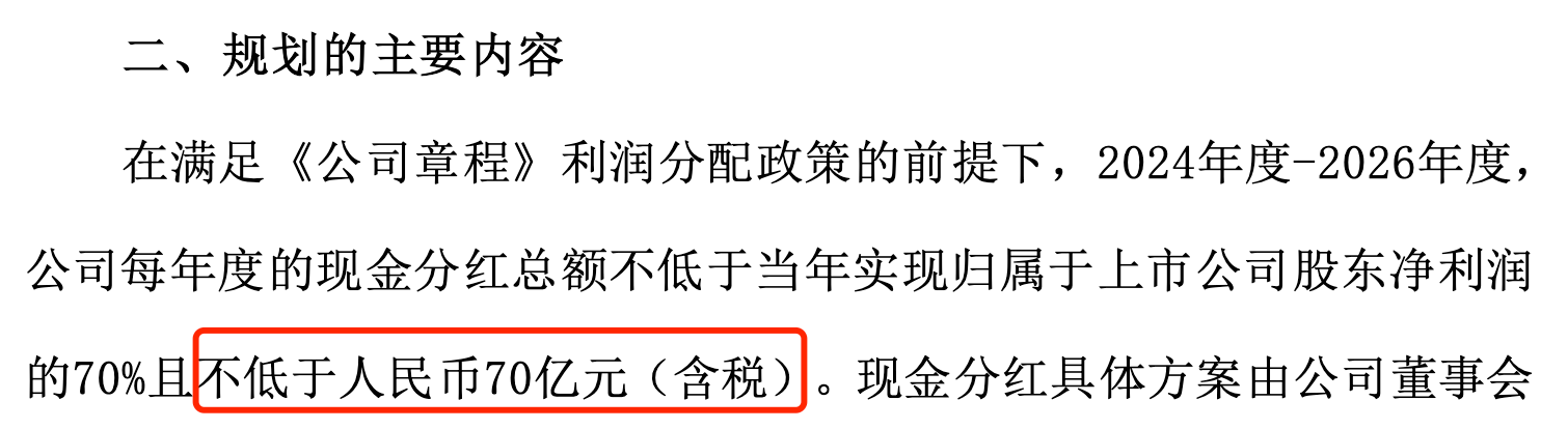2024年8月29日,洋河股份曾发布“关于现金分红回报规划(2024年度-2026年度)的公告”,其中明确表示,2024年度-2026年度,公司每年度的现金分红总额不低于当年实现归属于上市公司股东净利润的70%且不低于人民币70亿元(含税)。
