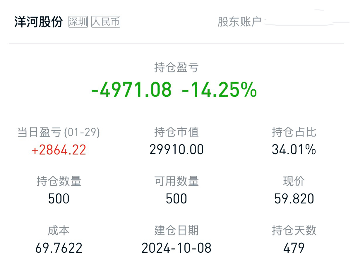 赵林对SmartHey表示,他在2024年10月8日国庆长假结束后以106元/股的价格建仓洋河股份,还花了数万元购入白酒基金。“以前在投资白酒上赚了一些钱,但当时已经空仓很久没看白酒的消息了,国庆假期无意中刷到白酒板块普遍上涨的消息,以为白酒终于触底反弹了,假期结束第一个交易日赶紧入场,没想到进去就‘高位站岗’了。”