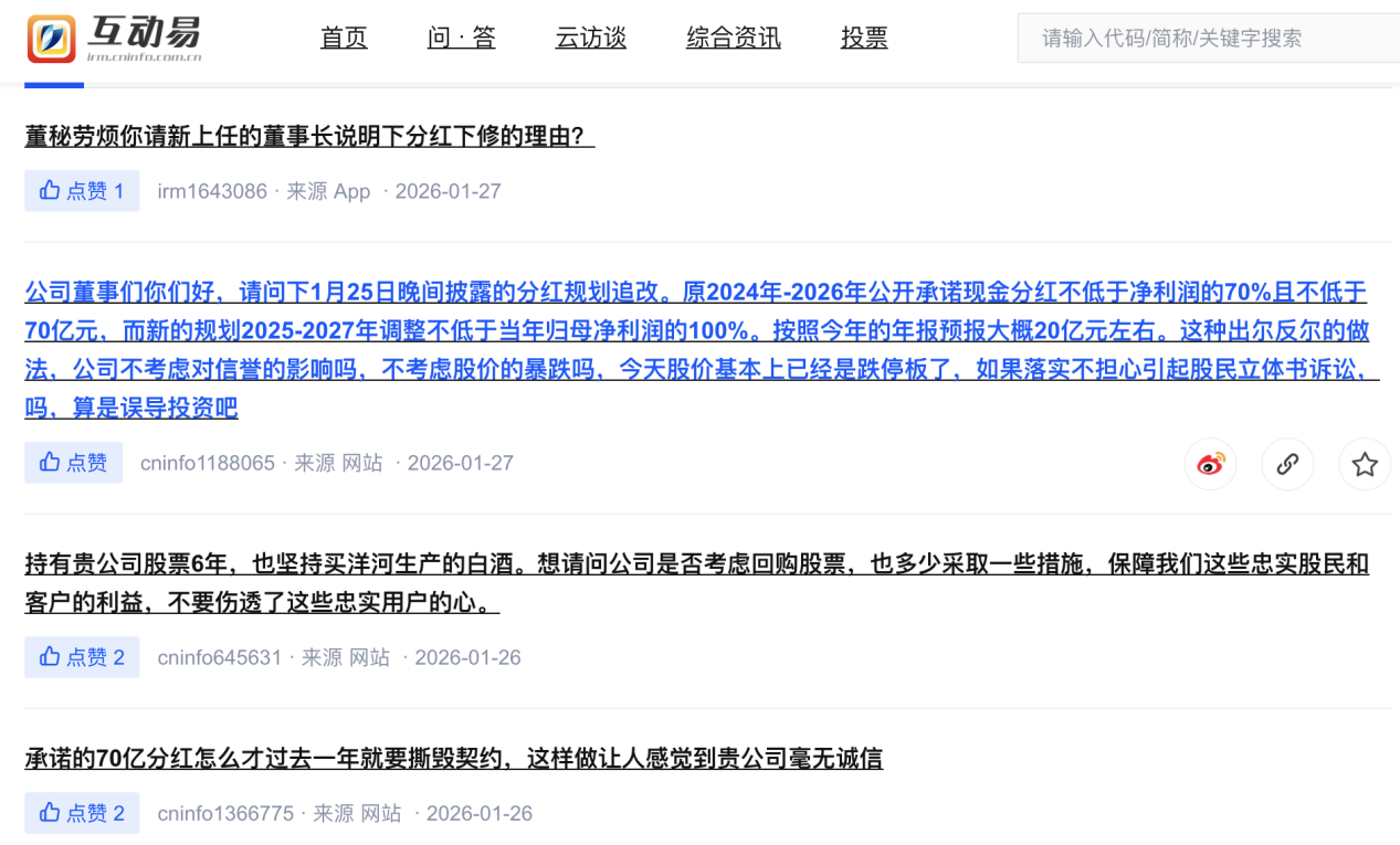 另一方面,洋河股份股价持续走低,原本承诺的分红金额在调整方案后也出现缩水,引发投资者强烈不满。