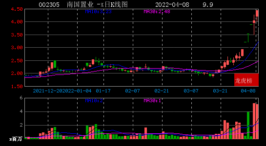 截止收盘,南国置业报收4.44元/股,涨幅9.9%,成交量505万手,成交额22.01亿元,换手率29.19%。今日1连板。