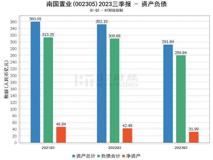 从资产负债方面看,南国置业2023年三季度末的总资产为291.84亿元,与上年度末的291.95亿元相比,微幅下滑0.04%。负债合计为259.84亿元,较上年度末的250.11亿元增加,资产负债率从上年度末的85.67%上升到本报告期末的89.04%。净资产为31.99亿元,较上年度末的41.84亿元下降。