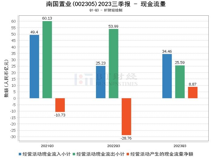 在现金流量方面,南国置业2023年三季度经营活动产生的现金流量净额为8.87亿元,较上年同期的-28.76亿元大幅增加130.83%。经营活动现金流入小计为34.46亿元,较上年同期的25.23亿元增加。经营活动现金流出小计为25.59亿元,较上年同期的53.99亿元减少。