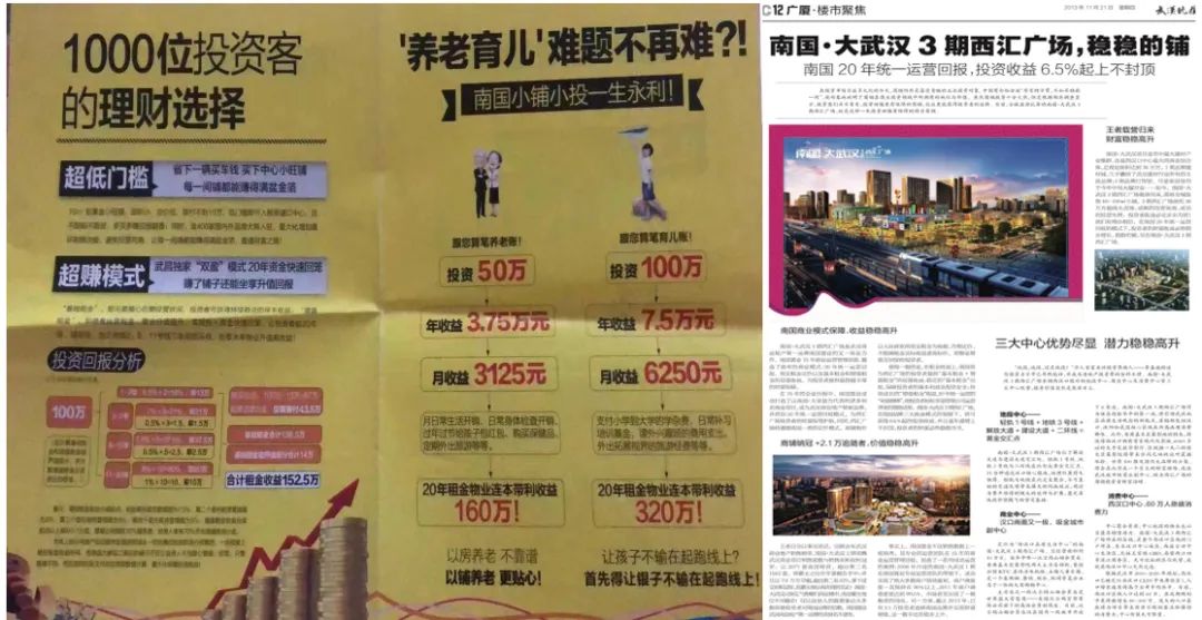 这些是2012年~2017年期间,在湖北省武汉、荆州、襄阳等地流传的南国系商铺项目的广告语,大阵仗的宣传攻势下,项目先后吸引了近2万人购买。