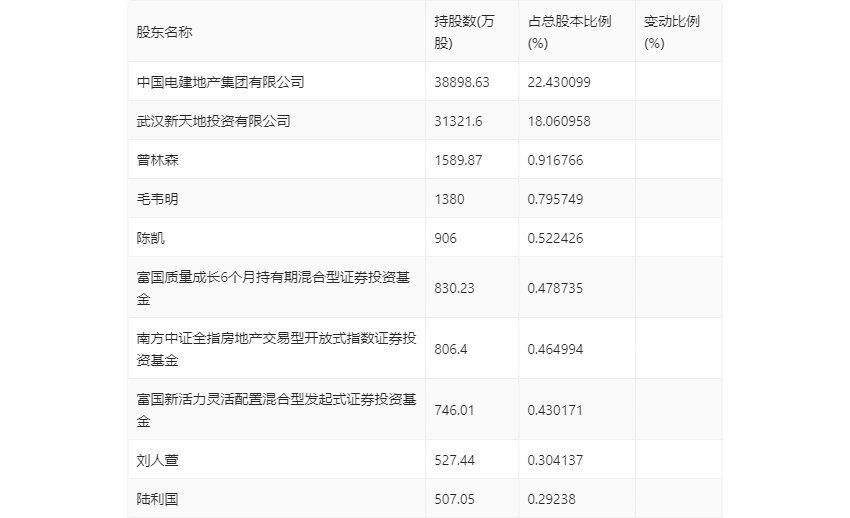 年报显示,2023年年末公司十大流通股东中,新进股东为富国质量成长6个月持有期混合型证券投资基金、富国新活力灵活配置混合型发起式证券投资基金、陆利国,取代了三季度末的安信策略精选灵活配置混合型证券投资基金、姚新华、安信远见成长混合型证券投资基金。在具体持股比例上,曾林森、毛韦明、陈凯持股有所上升,南方中证全指房地产交易型开放式指数证券投资基金、刘人萱持股有所下降。