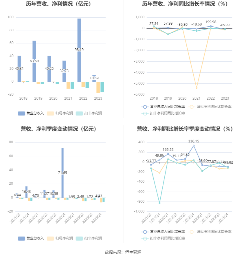 2023年,公司毛利率为-55.03%,同比下降61.91个百分点;净利率为-165.97%,较上年同期下降159.98个百分点。从单季度指标来看,2023年第四季度公司毛利率为-45.45%,同比下降54.92个百分点,环比上升30.96个百分点;净利率为-163.17%,较上年同期下降161.39个百分点,较上一季度上升17.52个百分点。