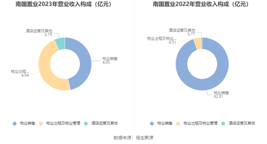 分产品来看,2023年公司主营业务中,物业销售收入4.95亿元,同比下降94.67%,占营业收入的46.74%;物业出租及物业管理收入4.94亿元,同比增长9.55%,占营业收入的46.67%;酒店运营及其他收入6979.42万元,同比下降9.43%,占营业收入的6.59%。