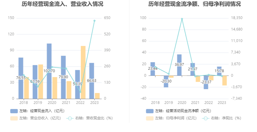 2023年,公司经营活动现金流净额为15.78亿元,同比增加39.15亿元;筹资活动现金流净额-17.59亿元,同比减少25.43亿元;投资活动现金流净额1.38亿元,上年同期为-6.09亿元。