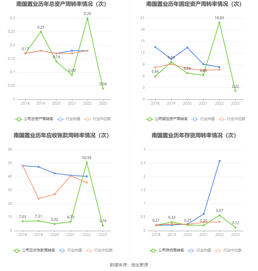 营运能力方面,2023年,公司公司总资产周转率为0.04次,上年同期为0.30次(2022年行业平均值为0.18次,公司位居同行业1/10);固定资产周转率为2.22次,上年同期为19.93次(2022年行业平均值为8.35次,公司位居同行业2/10);公司应收账款周转率、存货周转率分别为3.79次、0.12次。