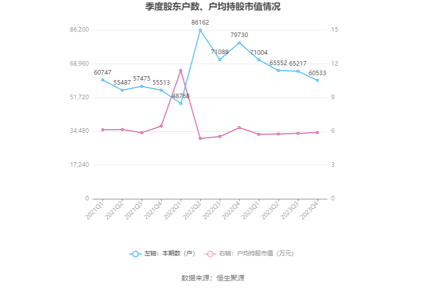 筹码集中度方面,截至2023年年末,公司股东总户数为6.05万户,较三季度末下降了4684户,降幅7.18%;户均持股市值由三季度末的5.82万元上升至5.90万元,增幅为1.37%。