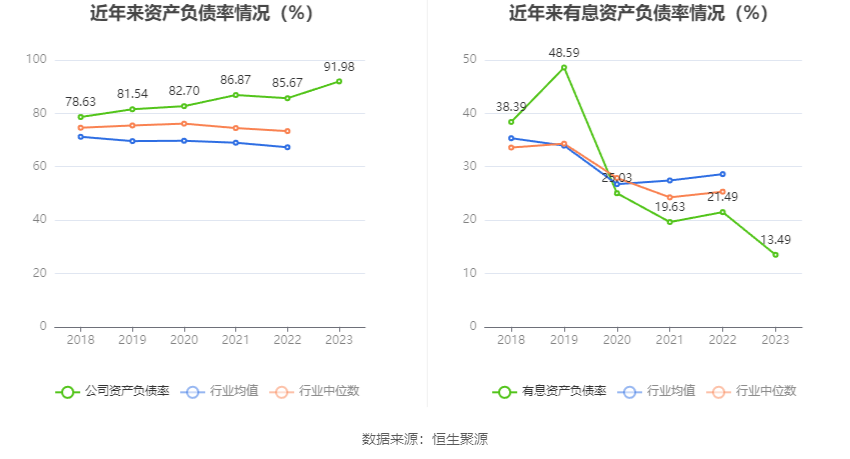 在偿债能力方面,公司2023年年末资产负债率为91.98%,相比上年末上升6.31个百分点;有息资产负债率为13.49%,相比上年末下降8.00个百分点。