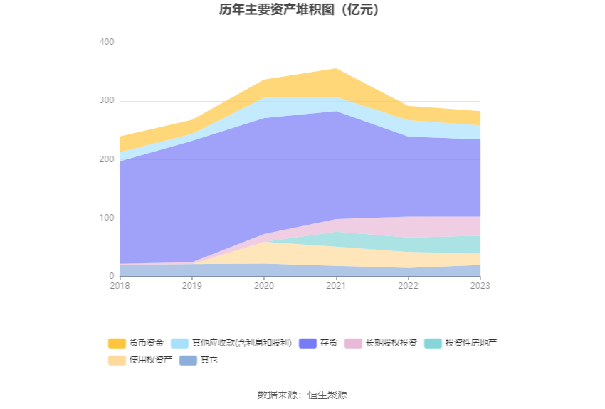 从存货变动来看,截至2023年年末,公司存货账面价值为131.88亿元,占净资产的2719.56%,较上年末减少4.89亿元。其中,存货跌价准备为4.05亿元,计提比例为2.98%。