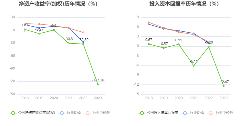 数据显示,2023年公司加权平均净资产收益率为-127.16%,较上年同期下降94.77个百分点;公司2023年投入资本回报率为-12.47%,较上年同期下降12.27个百分点。