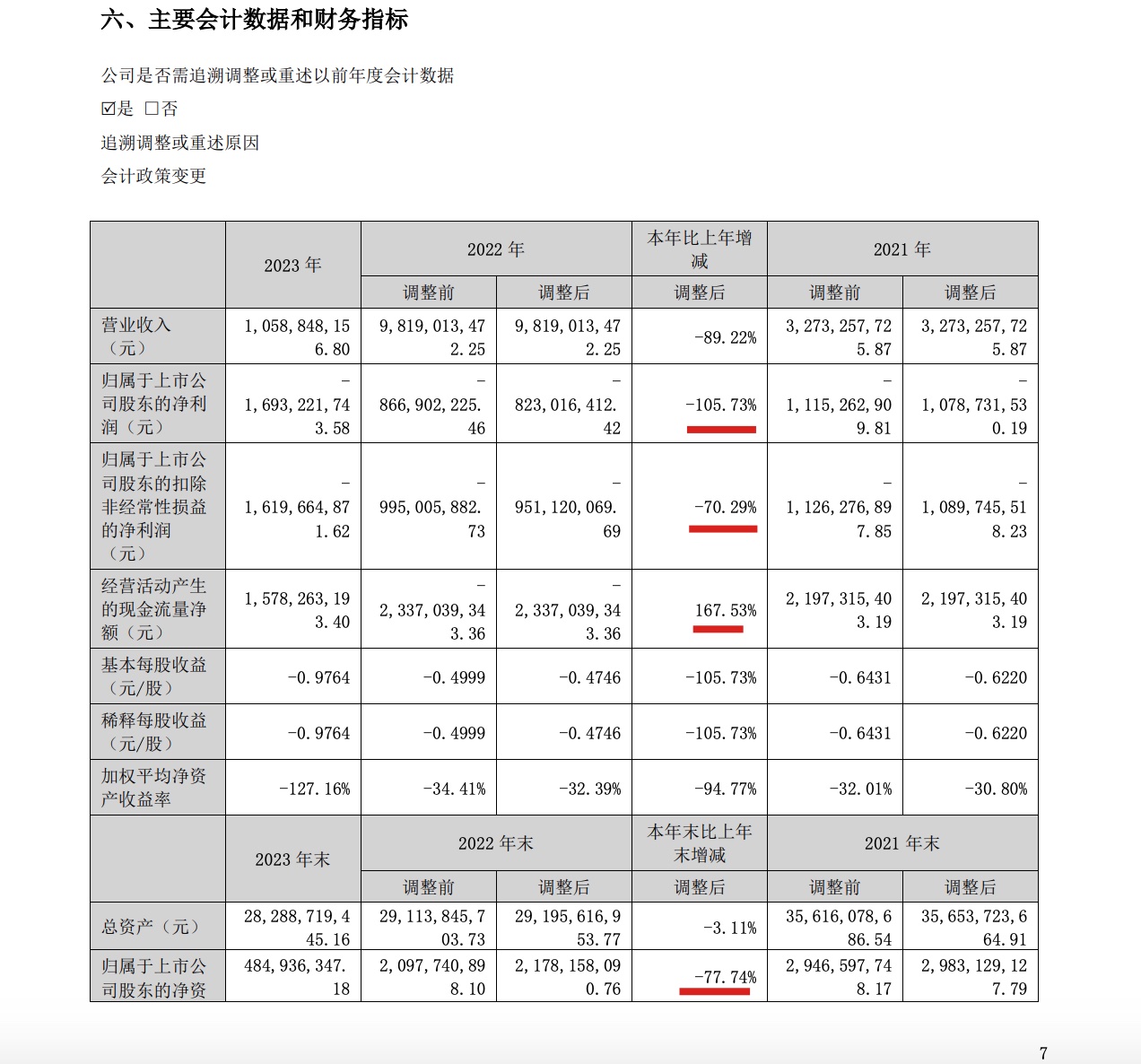 公告披露,2023年,公司实现营业收入10.59亿元,同比下降89.22%;归属于上市公司股东的净利润为-16.93亿元,同比亏损扩大105.73%;归属于上市公司股东的扣非净利润为-16.2亿元,同比亏损扩大70.29%。经营活动产生的现金流量净额为15.78亿元,同比增加167.53%。基本每股收益0.9764元/股。加权平均净资产收益率-127.16%,同比减少94.77个百分点。