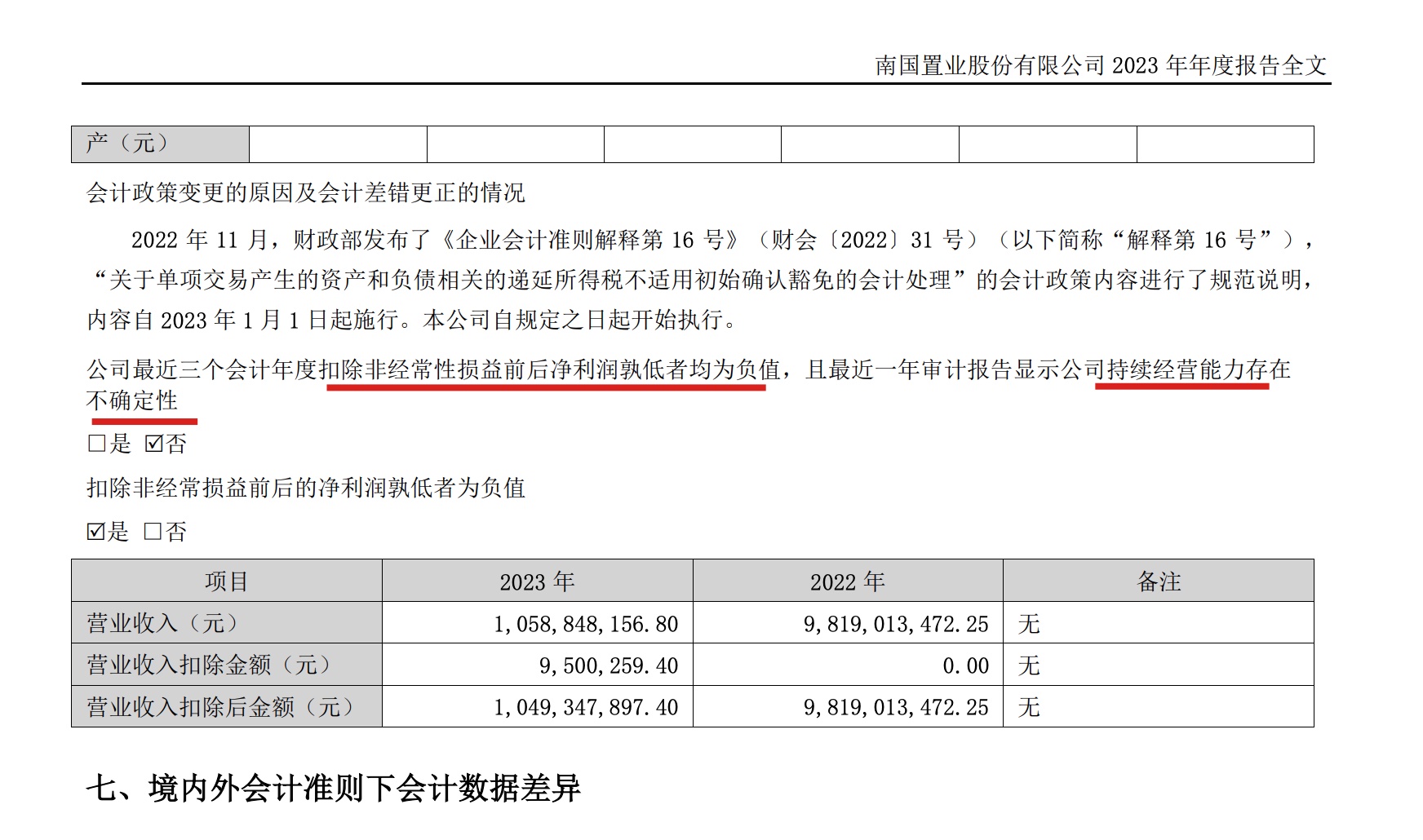 同时,南国置业提示,公司最近三个会计年度扣除非经常性损益前后净利润孰低者均为负值,且最近一年审计报告显示公司持续经营能力存在不确定性。