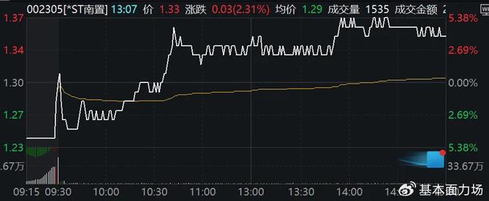 五一节前最后一个交易日也即4月30日,是*ST南置披星戴帽后的第一个交易日,股价表现挺有意思,早盘开盘以跌停开盘,随后被快速拉升,盘中大幅震荡甚至一度冲至涨停,尾盘收涨3.85%,也即在被ST当天,股价却不跌反涨。
