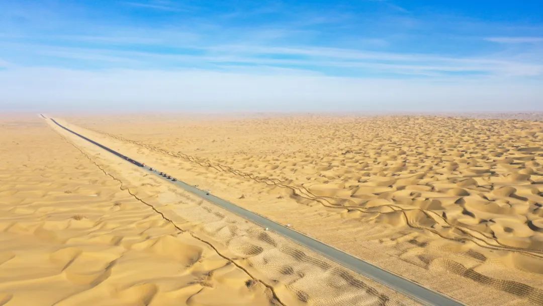 图为国际事业部塔中沙漠公路项目沥青路面施工俯瞰图