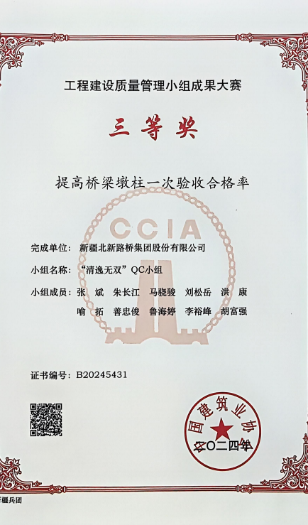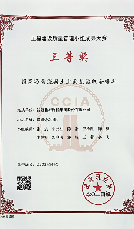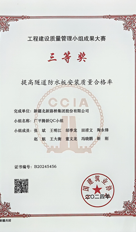 近日,新疆北新路桥集团股份有限公司申报的提高隧道防水板安装质量合格率、提高沥青混凝土上面层验收合格率、提高桥梁墩柱一次验收合格率三项QC成果荣获中国建筑业协会三等奖。