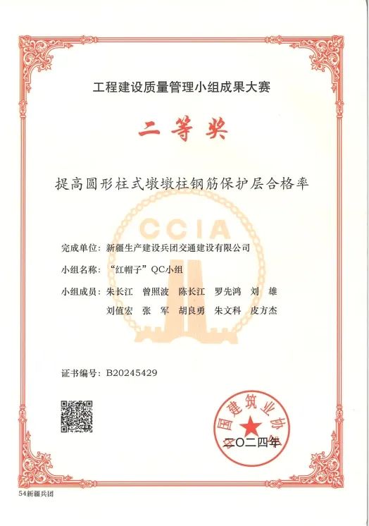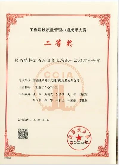 近日,中建协公布关于《2024年工程建设质量管理小组成果大赛名单公示》,北新路桥集团兵团交建公司提交的《提高路拌法石灰改良土路基一次验收合格率》《提高圆形柱式墩墩柱钢筋保护层合格率》的QC成果,均取得二等奖的好成绩。