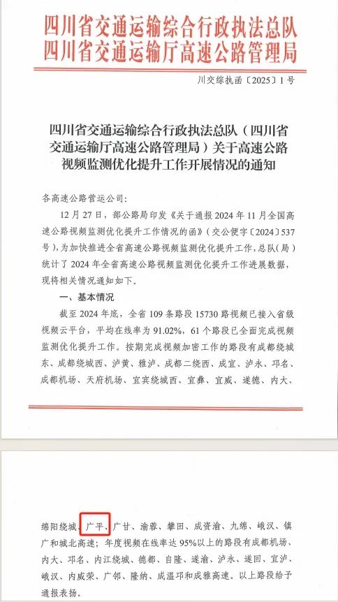 近日,四川省交通运输综合行政执法总队、四川省交通运输厅高速公路管理局联合下发《关于高速公路视频监测优化提升工作开展情况的通知》,由北新路桥集团承建、运营的广平高速视频检测优化提升工作受到表彰。