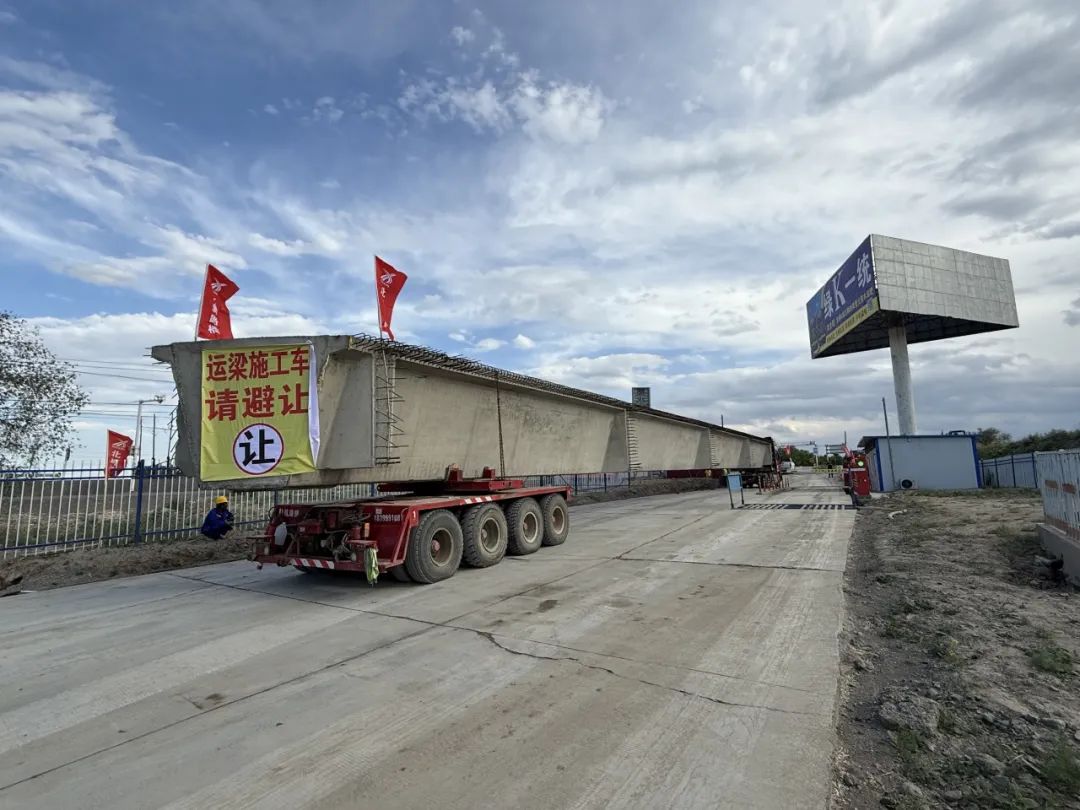 兵团交建公司第八师G576一标项目工程施工迎来关键节点,首榀长40米、高2米、翼板宽2.4米、重176吨的预制箱梁顺利运输至现场存梁场,标志着项目正式进入桥梁上部结构施工阶段,为后续架梁作业提供了重要保障。