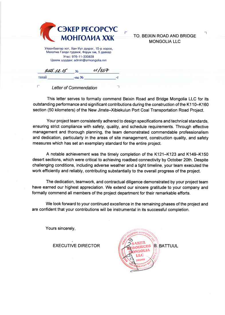此次表扬信不仅是对北新路桥集团项目团队一年来辛勤付出的认可,也是对集团海外项目管理水平和企业品牌形象的有力彰显。未来,北新路桥集团将持续深耕海外市场,以更优的履约能力、更强的责任担当,为深化中蒙基础设施合作、助力区域互联互通贡献更多北新力量。