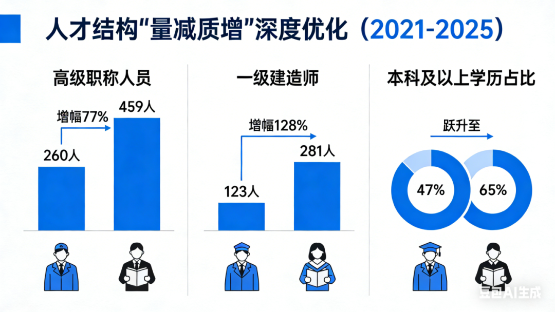人才结构实现“量减质增”的深度优化,五年来,高级职称人员从260人增至459人,增幅77%;一级建造师从123人增至281人,增幅128%;本科及以上学历占比从47%跃升至65%。