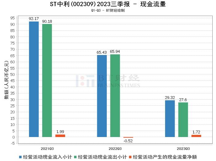 在现金流量方面,ST中利2023年三季度经营活动产生的现金流量净额为1.72亿元,相比上年同期的-5159.5万元,增加了433.45%。经营活动现金流入小计为29.32亿元,相比上年同期的65.43亿元有所减少。经营活动现金流出小计为27.6亿元,相比上年同期的65.94亿元也有所减少。