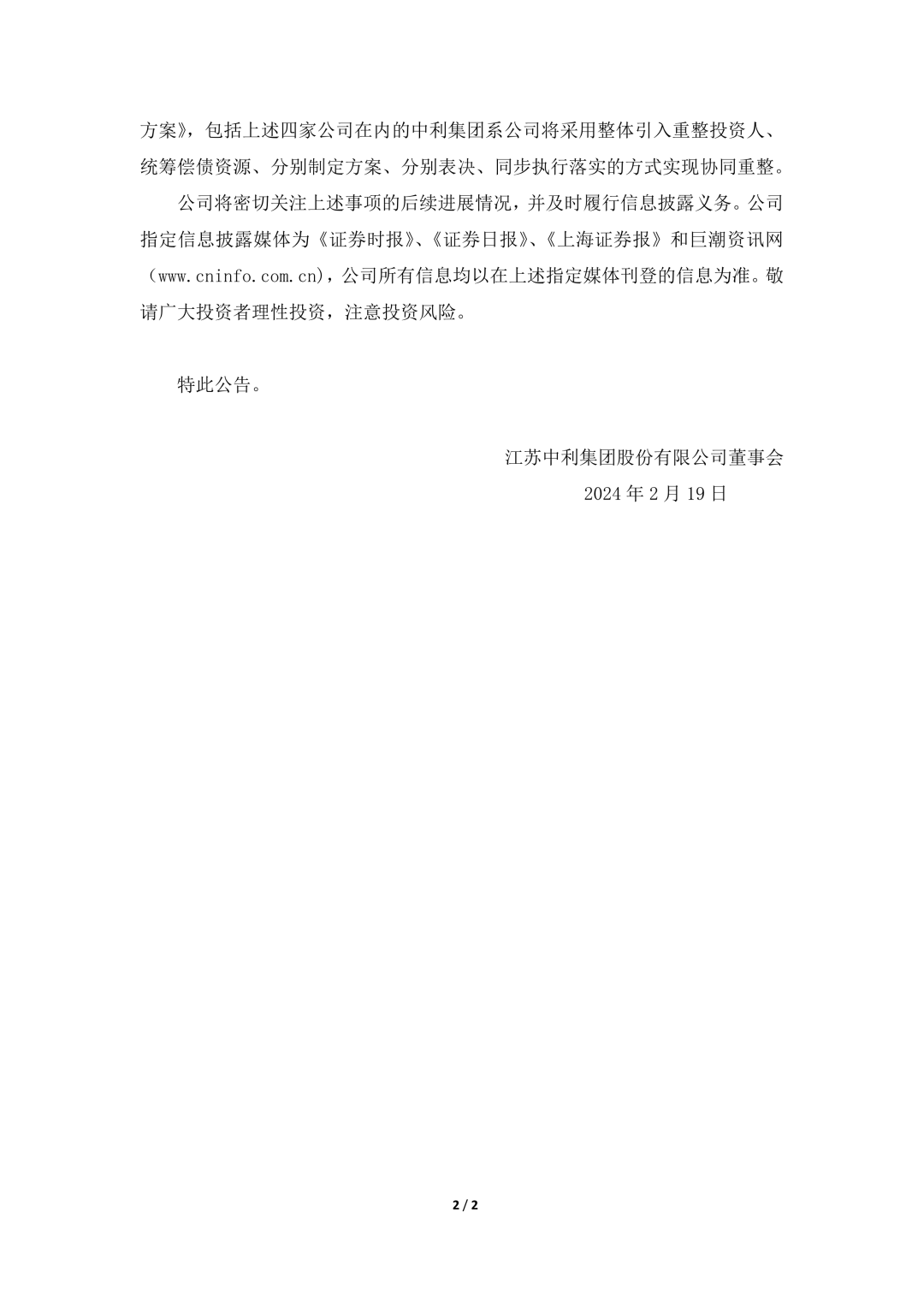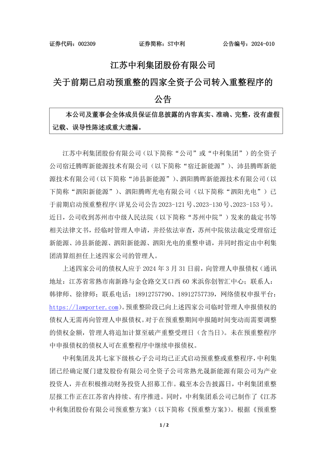 2月20日,ST中利发布关于前期已启动预重整的四家全资子公司转入重整程序的公告。
