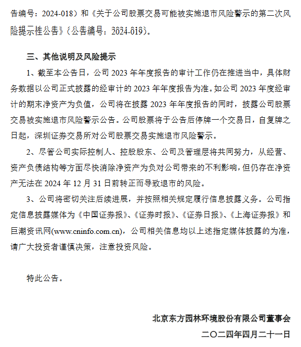 4月20日,北京东方园林环境股份有限公司(以下简称“公司”)预计2023年度期末归属于上市公司股东的净资产为负值。根据《深圳证券交易所股票上市规则》的有关规定,公司股票交易可能在披露2023年年度报告后被实施退市风险警示。