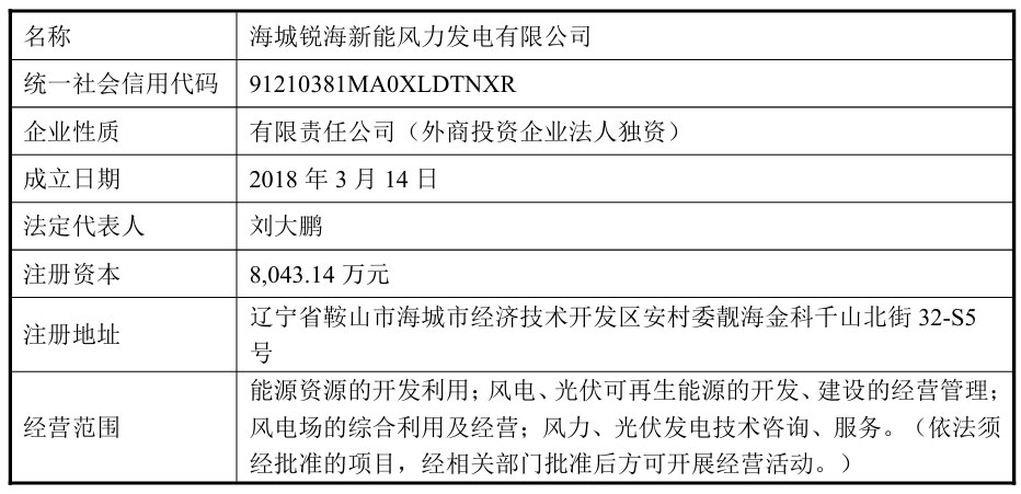 另一家公司海城锐海,专注于分散式风电场业务,注册资本8043.14万元,下属5家风电场均位于辽宁鞍山海城地区,截至2025年6月30日已并网规模41.00MW,2024年实现营收4418.58万元,净利润276.05万元。