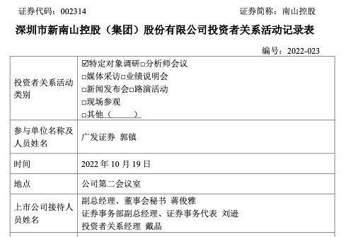 10月20日晚间,深圳市新南山控股(集团)股份有限公司(以下简称“南山控股”或“公司”)发布公告,公告称,公司于10月19日接受了广发证券的特定对象调研。调研中,公司表示,今年计划结转项目主要分布在深圳、上海、武汉等地,项目平均去化率超过八成,能够对经营业绩的实现起到良好支撑作用。
