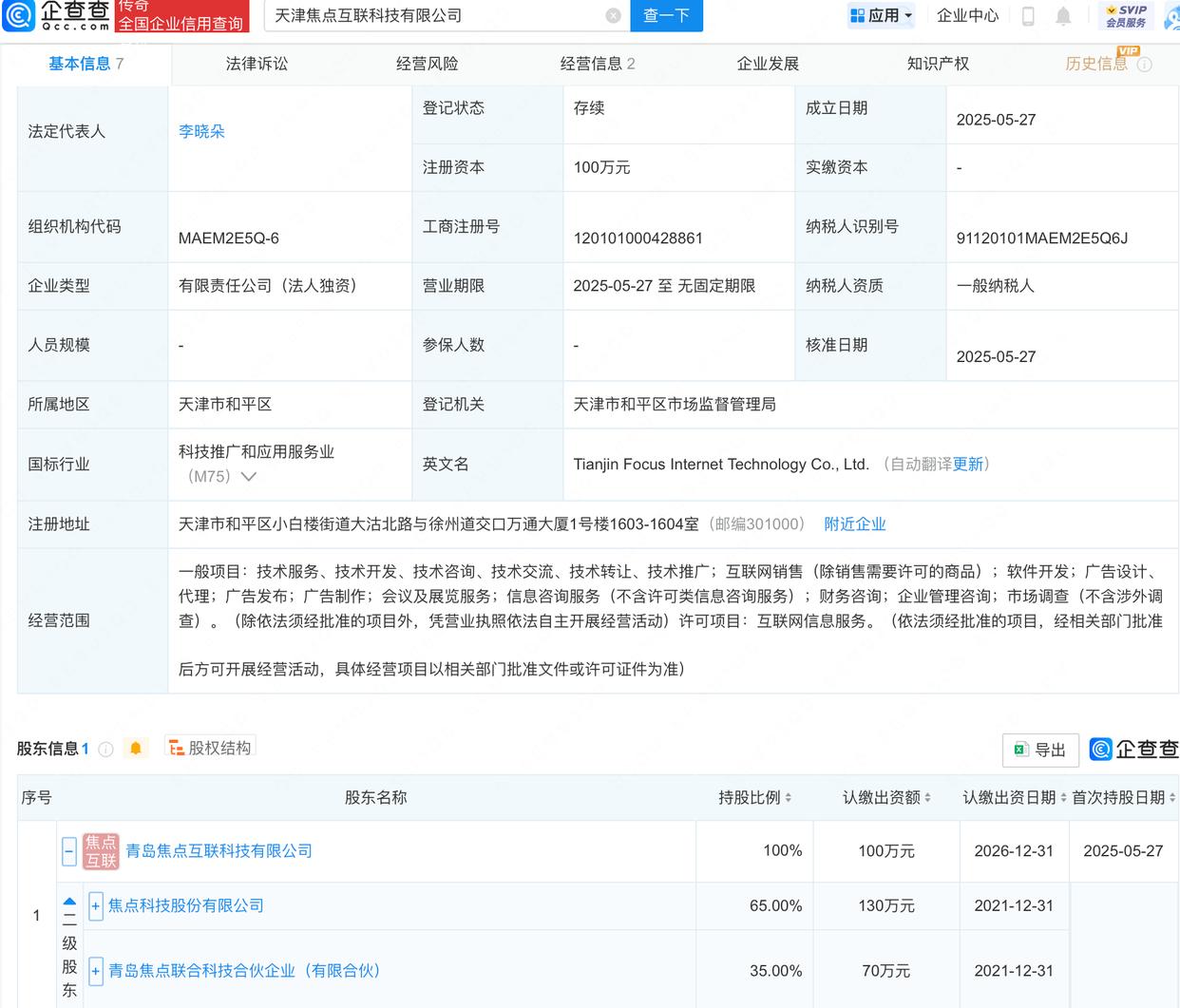 近日,天津焦点互联科技有限公司成立,法定代表人为李晓朵,经营范围包含:软件开发;广告设计、代理;广告发布;广告制作;会议及展览服务等。股权穿透显示,该公司由焦点科技(002315)旗下青岛焦点互联科技有限公司全资持股。
