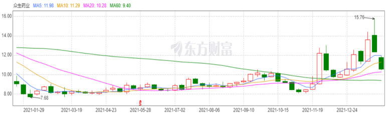 2021年全年,众生药业股价并未出现较大涨幅,一直停留在10元/股上下浮动,在2021年5月28日以0.02元/股进行了一次派息后,其股价走势也为出现涨幅。直至2022年1月,在新冠口服药概念股的加持下,众生药业迎来了上涨,1月21日股价触及一年内的最高点15.67元/股。
