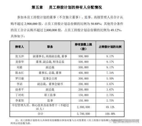 今年3月,众生药业(002317)发布《2022年员工持股计划(草案)》,总股数不超过570万股,副董事长张玉冲、总裁陈永红、CFO龙春华等9名高管认购总数的51%,认购价格为目前股价50%。