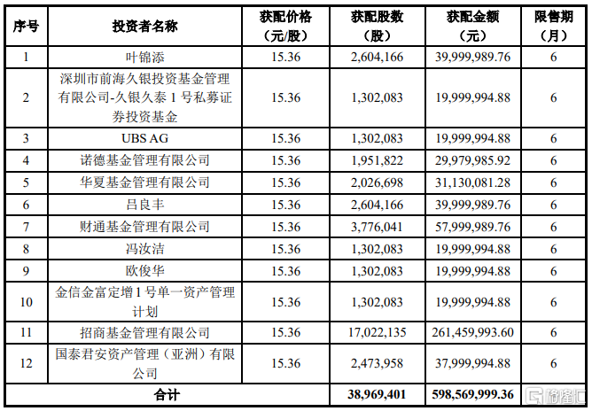 6月19日众生药业(002317.SZ)公布2022年向特定对象发行股票并在主板上市发行情况报告书,确定本次发行价格15.36元/股,发行股数3896.9401万股,募集资金总额约5.99亿元。本次发行对象最终确定12家。发行配售结果如下: