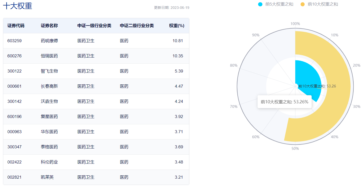 数据显示,截至2023年6月19日,该指数前十大权重股包含药明康德、恒瑞医药、智飞生物、长春高新、沃森生物等,前十大集中度为53.26%。(数据来源:中证指数公司,指数成份股不代表个股推荐)