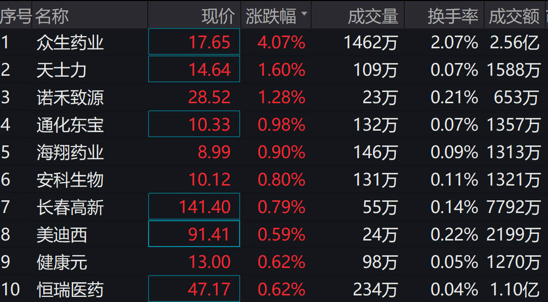 该基金紧密跟踪中证创新药产业指数,该指数现上涨0.25%,指数成份股中,众生药业上涨4.07%,天士力上涨1.6%,诺禾致源、通化东宝等个股跟涨。