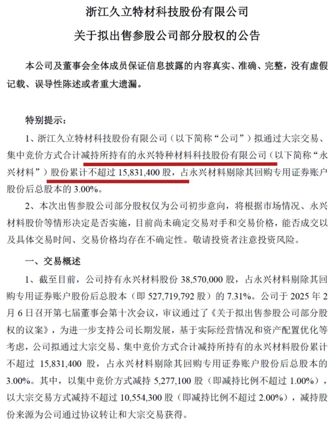 2月7日晚间,一则公告引发市场关注:久立特材宣布拟通过大宗交易、集中竞价方式减持所持有的永兴材料股份,累计不超过约1583万股,占总股本的3%。