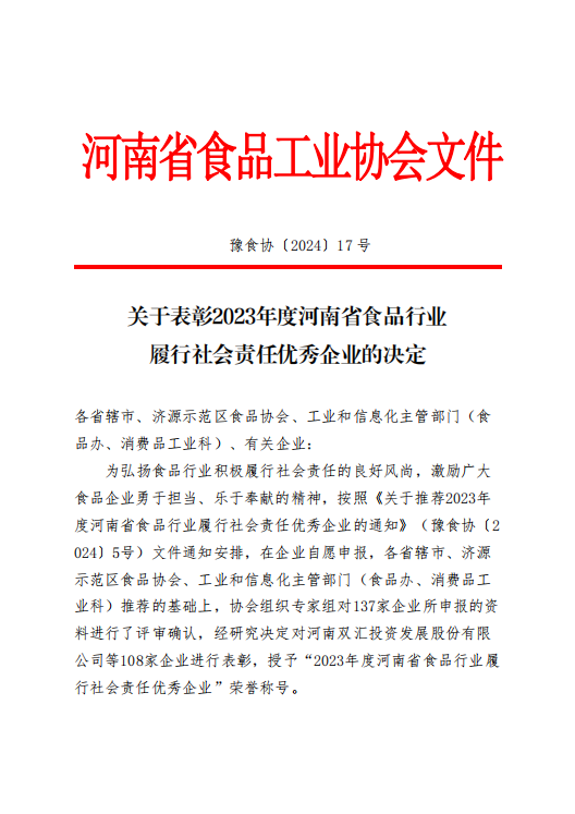 华英农业荣获2023年度河南省食品行业履行社会责任优秀企业荣誉称号