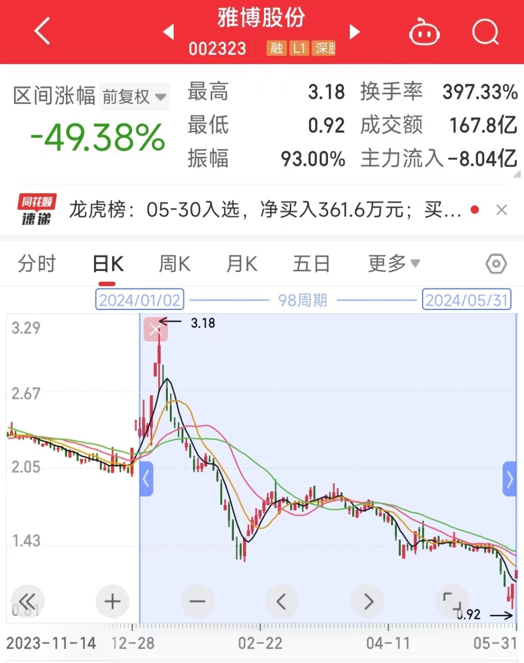 继昨日上演“地天板”之后,5月31日,雅博股份开盘后快速涨停,截至午间收盘,报1.23元/股,涨幅为9.82%,市值为26.09亿元。