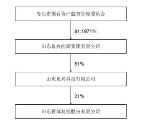 公开资料显示,山东泉兴科技有限公司(简称“泉兴科技”)持有雅博股份21%的股权,是其第一大股东。从股东背景来看,泉兴科技由山东泉兴能源集团51%控股,枣庄市财金控股集团和山东财汇控股集团分别持股30%、19%,股权可最终穿透至枣庄市国资委。