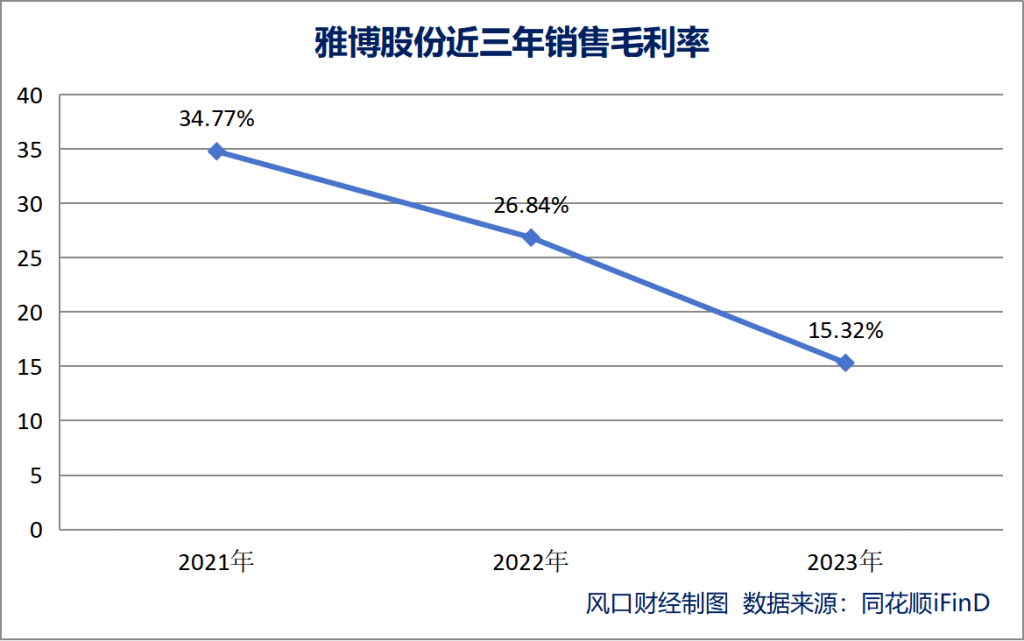 此外,近三年雅博股份毛利率也直线下滑,2021年-2023年,公司毛利率分别为34.77%、26.84%及15.32%。