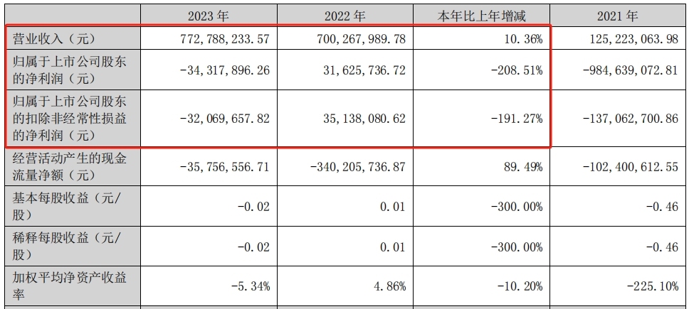 雅博股份经营活动现金流量净额已经连续三年为负值,2021年-2023年,公司经营活动现金流量净额分别为-1.02亿元、-3.40亿元及-3575.66万元。