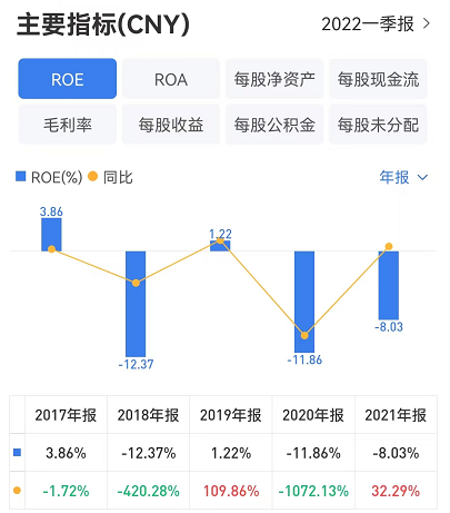 从净资产收益率(ROE)来看,2018年-2021年,洪涛股份ROE分别为-12.37%、1.22%、-11.86%、-8.03%。ROE连续两年为负。