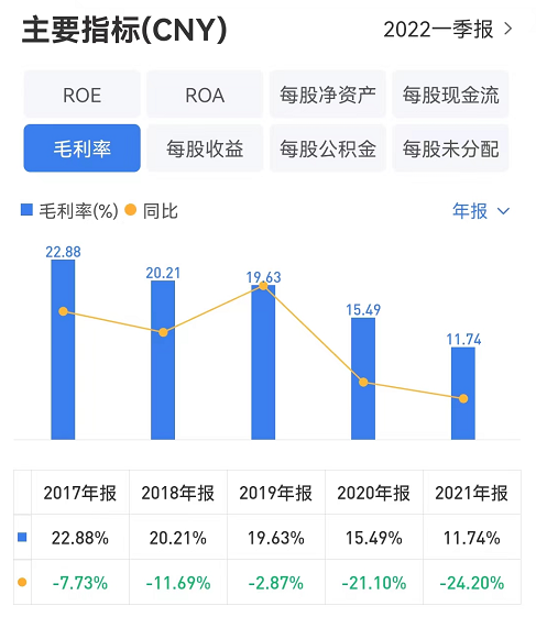 2017年-2021年,洪涛股份毛利率分别为22.88%、20.21%、19.63%、15.49%、11.74%。其毛利率连续五年下滑。