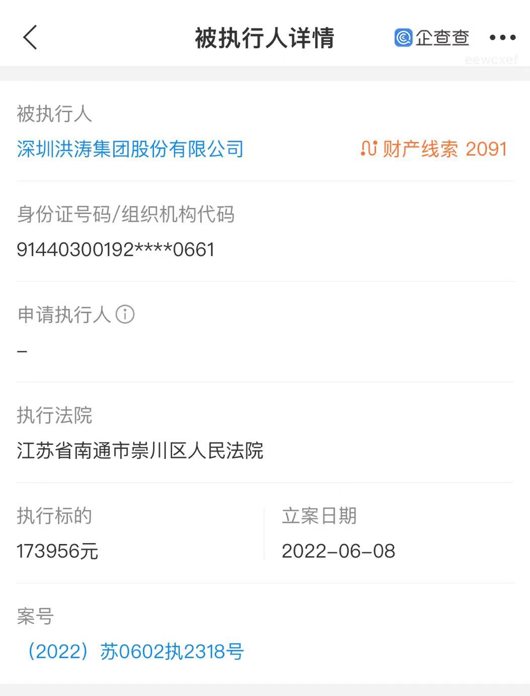 6月14日,深圳洪涛集团股份有限公司(以下简称“洪涛股份”)成为被执行人,执行标的金额173956元,立案日期为为2022年6月8日,执行法院为江苏省南通市崇川区人民法院,案号为(2022)苏0602执2318号。